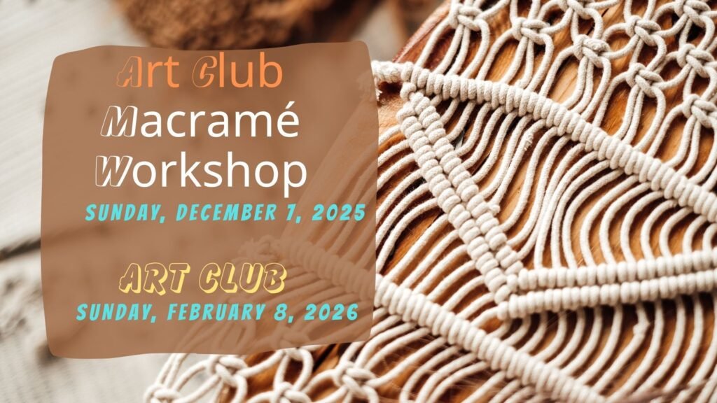 The Art Club is back for another season of creativity and connection! Our first session kicks off with a Macramé Workshop on December 7, where participants will learn the timeless craft of knotting beautiful designs. You’ll create your own macramé piece — whether a wall hanging, keychain, or plant holder — while enjoying the calming, hands-on process of working with natural fibers.